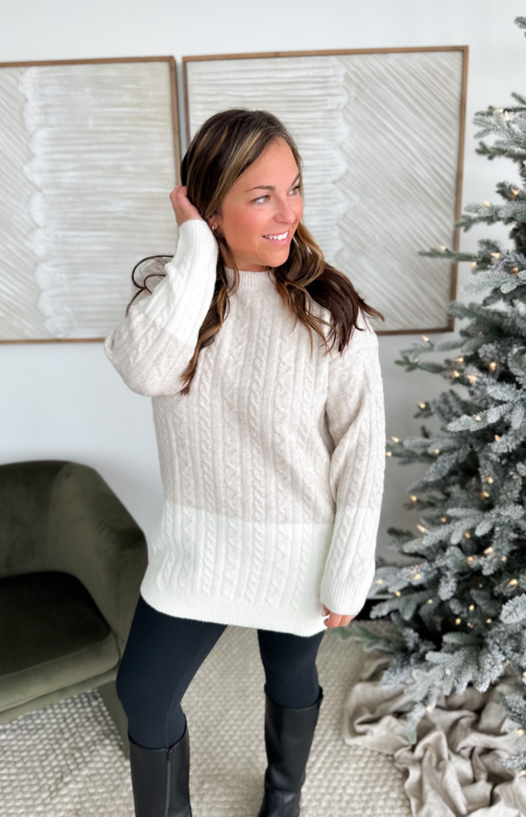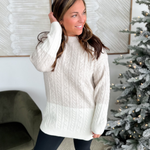 This taupe and cream cable knit sweater dress is the perfect blend of cozy and festive. The soft knit fabric and classic cable design make it warm and comfortable, while the mini length keeps it fun and flirty for the holidays. The neutral tones give it a timeless look that pairs beautifully with boots or tights. Whether you’re heading to a holiday gathering or a cozy night in, this dress is an effortless way to look chic and feel comfortable all season long.