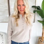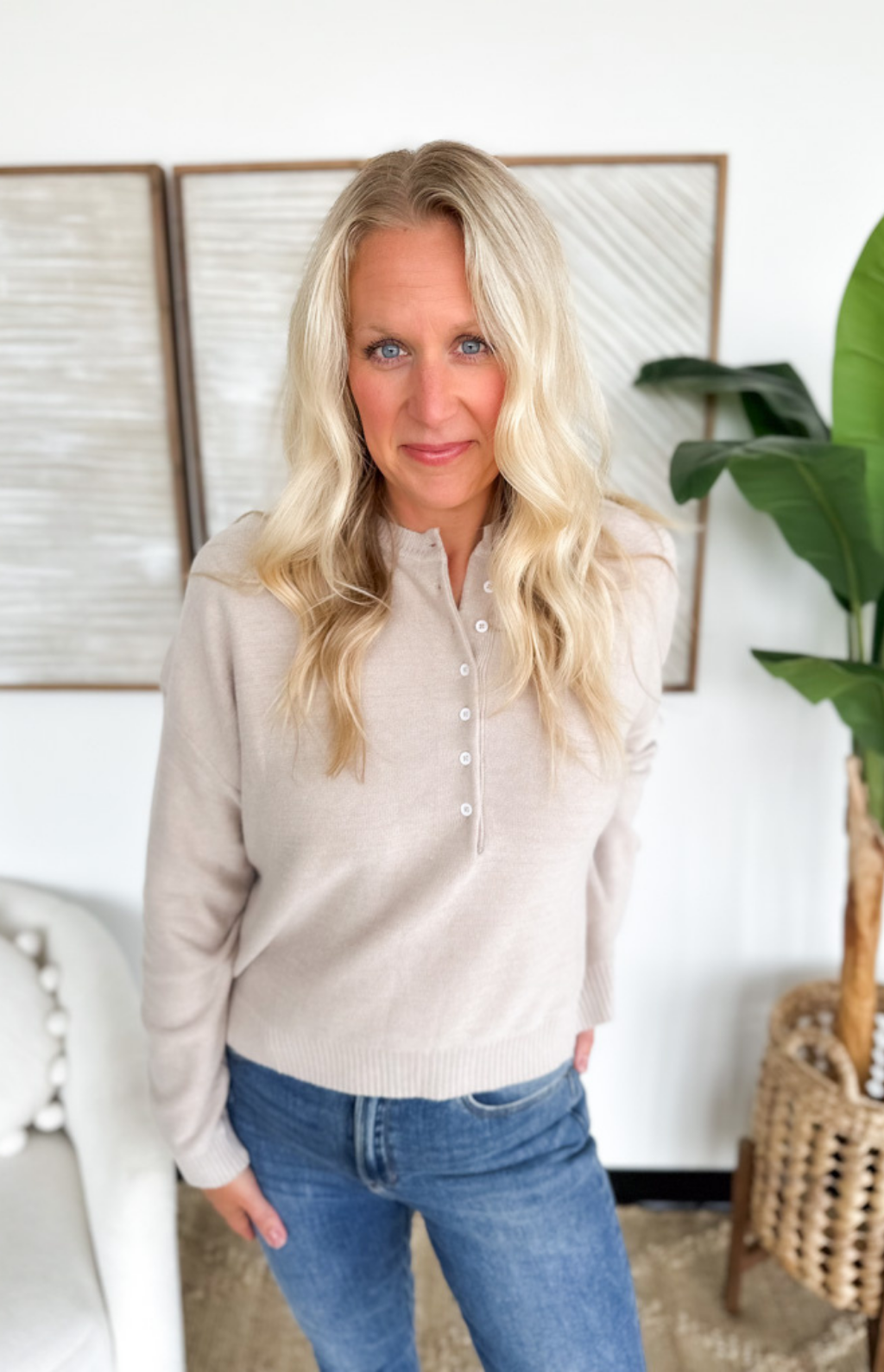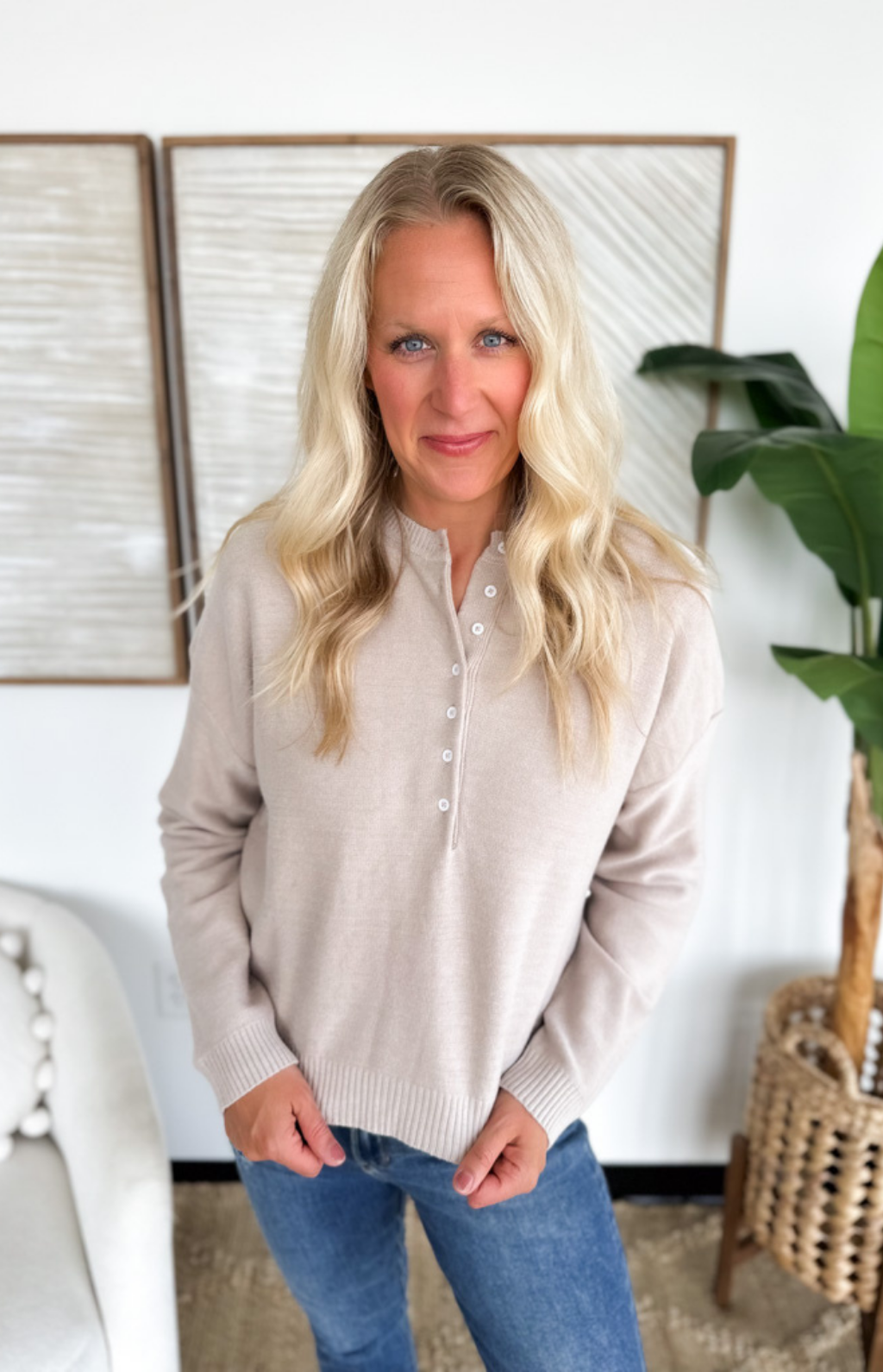 This taupe knit sweater is a timeless staple with a touch of casual charm! The half-up button detail adds just the right amount of interest while letting you adjust the neckline to your liking. Soft, cozy, and easy to style, it pairs perfectly with jeans for a relaxed day out or with trousers for a more polished vibe. A go-to layer you’ll reach for again and again when you want effortless comfort that still looks put-together!