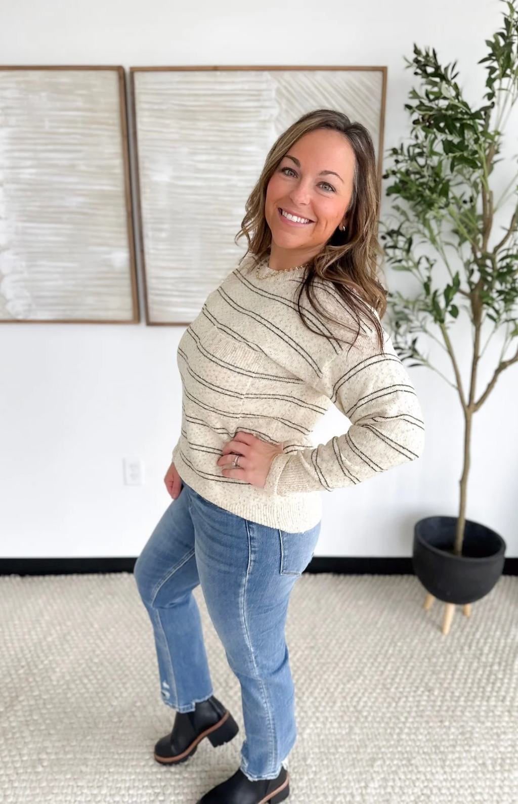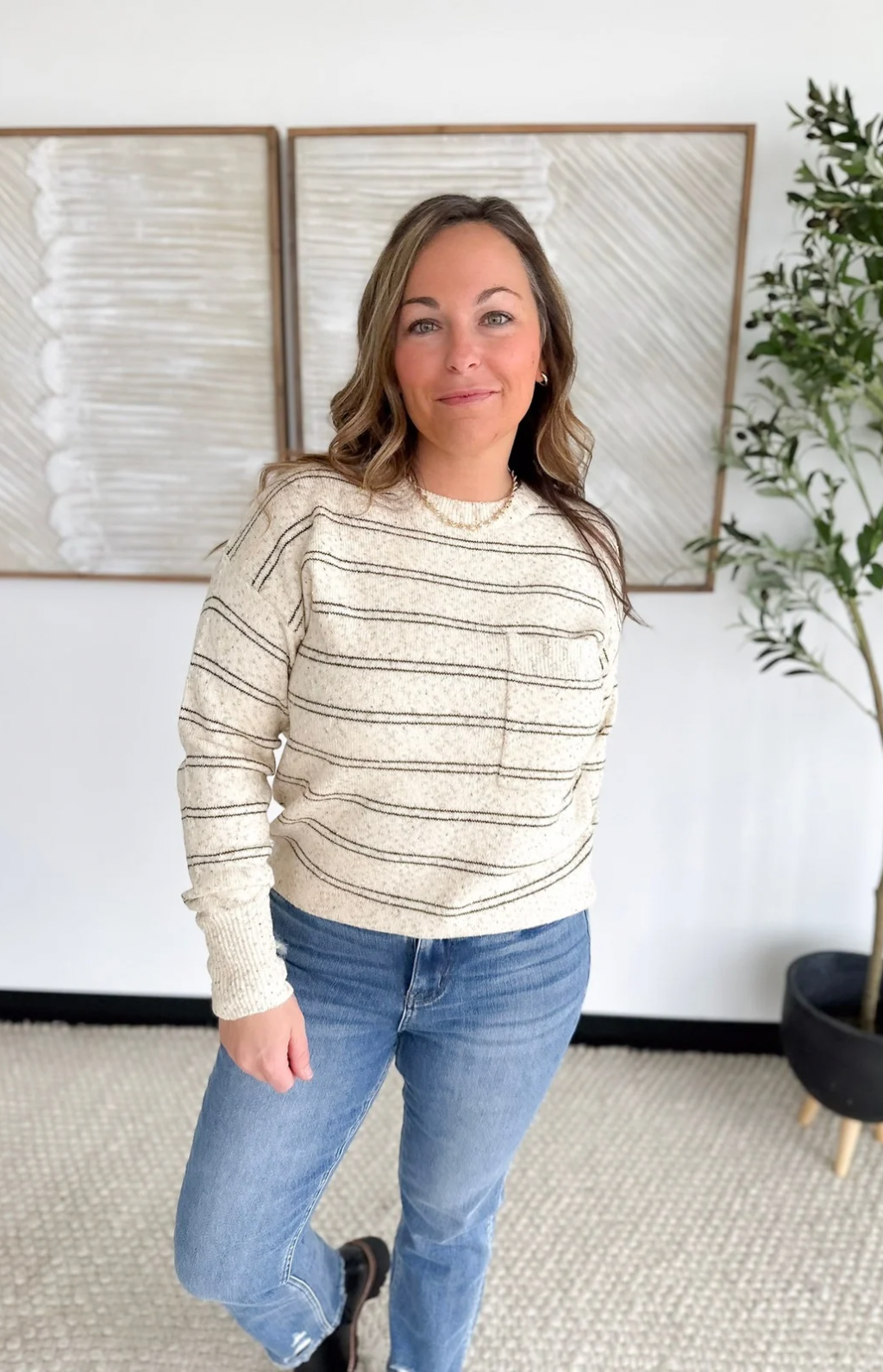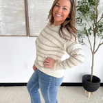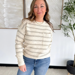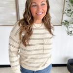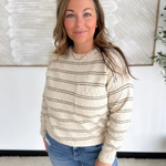 This taupe knit long sleeve top is the perfect mix of cozy texture and everyday style. The thin olive stripes add a subtle pop of color, while the speckled knit detailing gives it a soft, lived-in look you’ll love. With its relaxed fit and lightweight feel, it’s an easy piece to throw on with jeans or layer under a jacket. Effortless, comfortable, and perfectly neutral—this top is made for laid-back days with a touch of style.