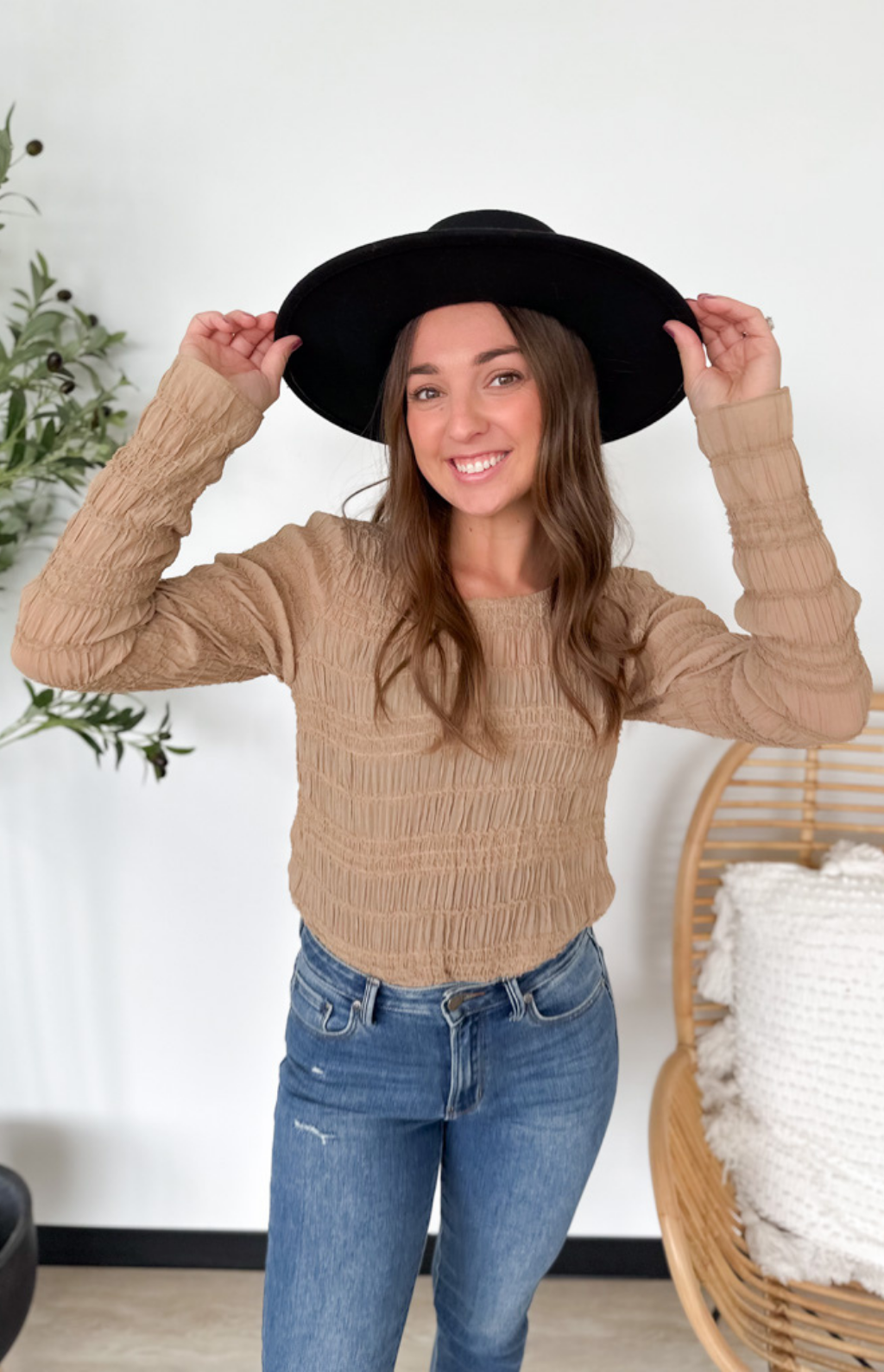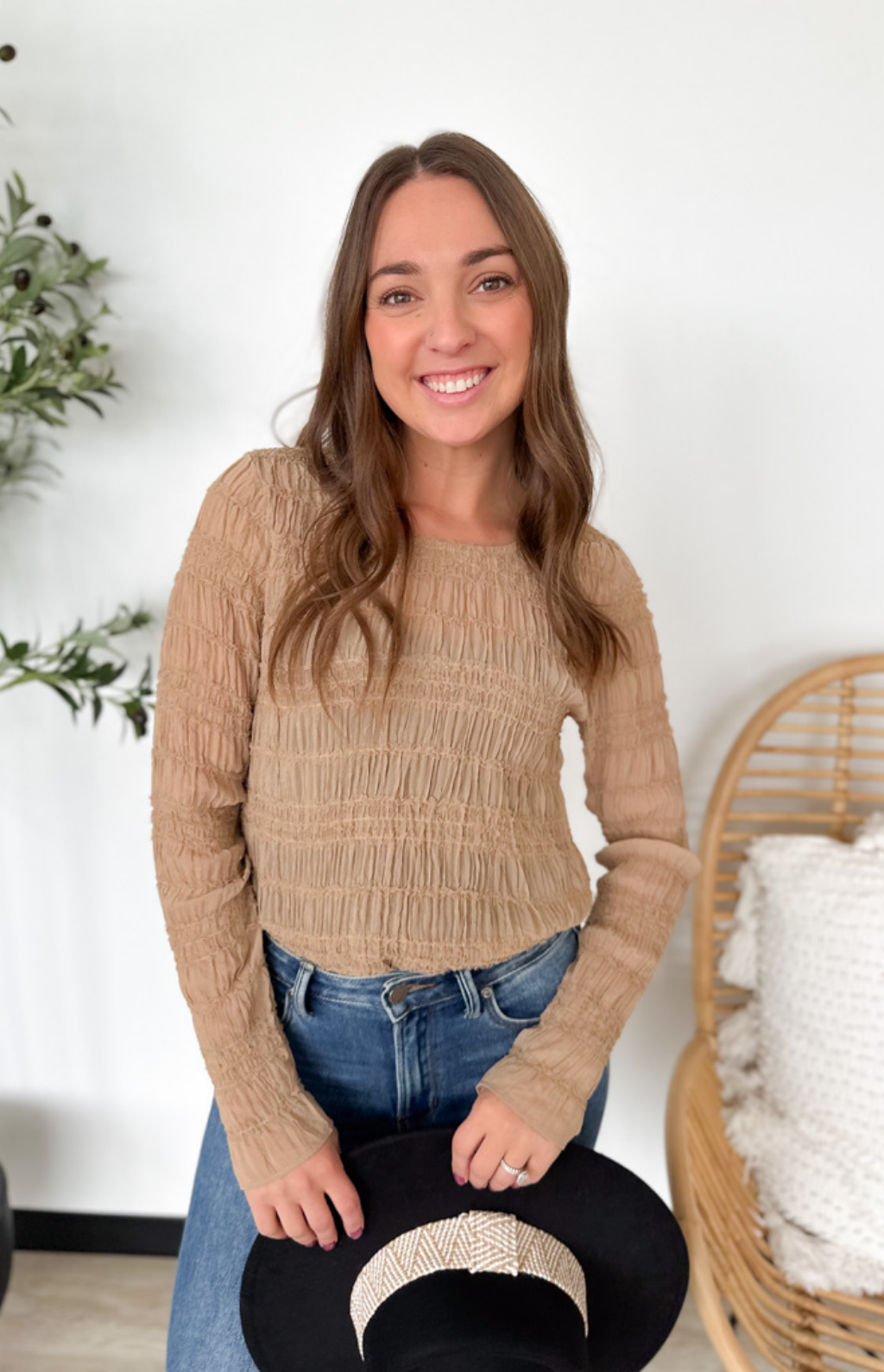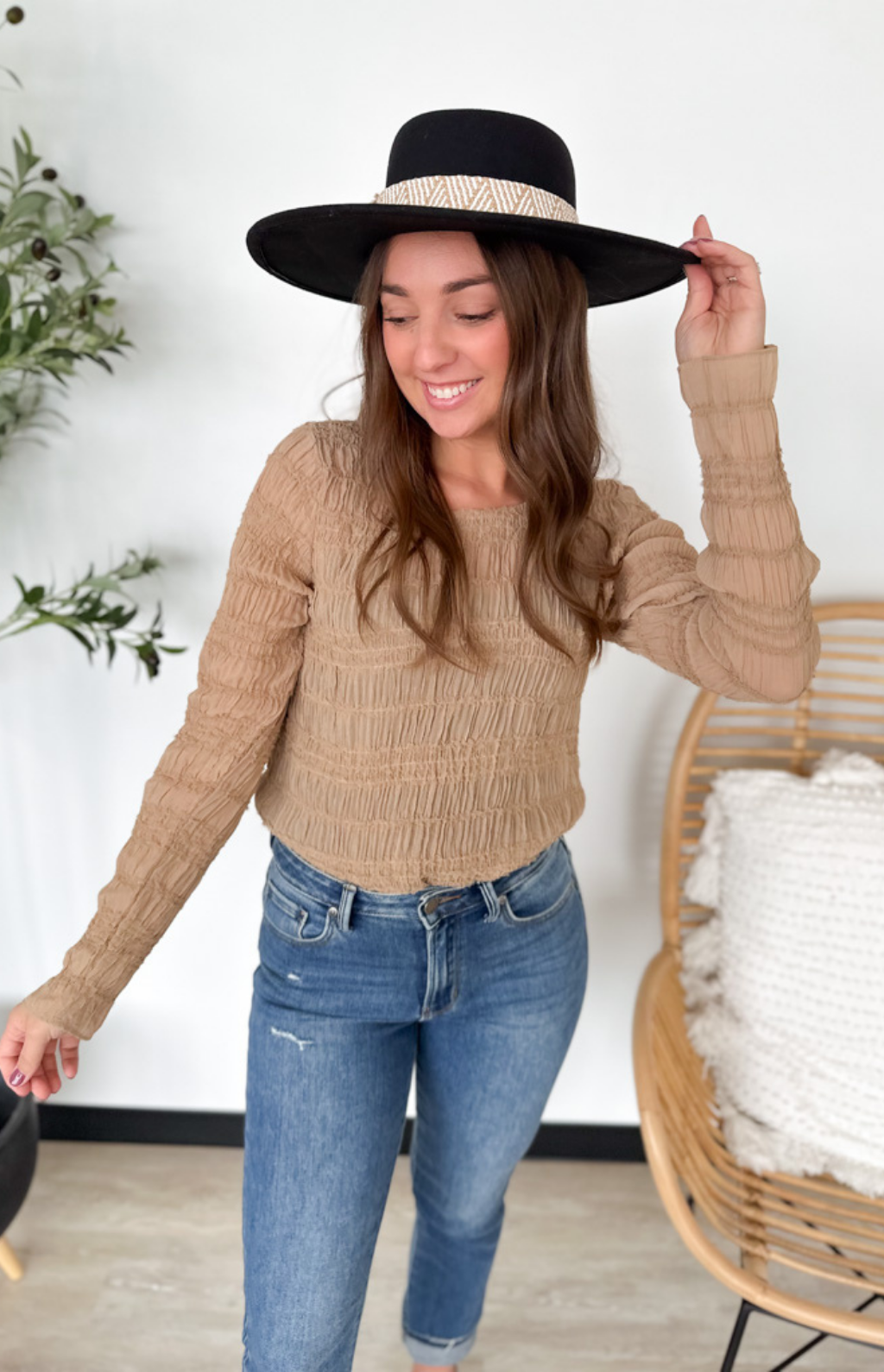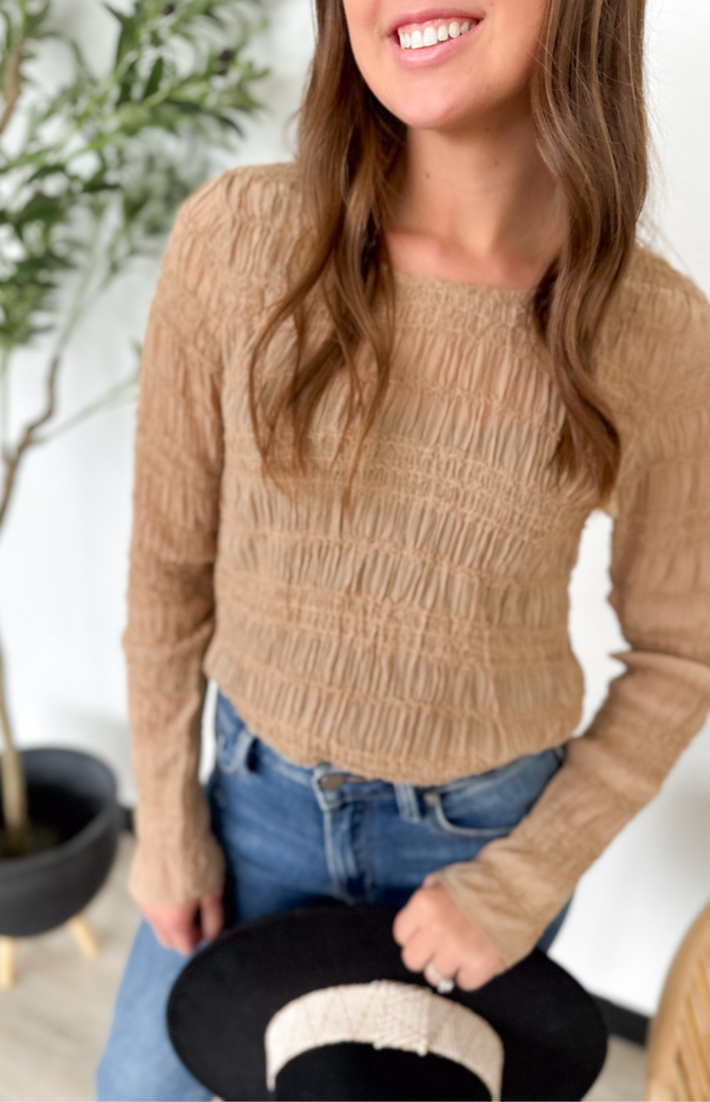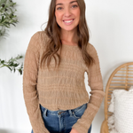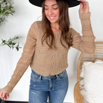 This taupe lightweight sheer top is feminine, flattering, and effortlessly chic. The smocked fit hugs in all the right places while keeping things comfortable, and the sheer long sleeves add a soft, delicate touch. Perfect for layering under jackets or pairing with high-waisted jeans or skirts, it’s an easy way to elevate your everyday look. The neutral taupe hue makes it endlessly versatile, so you can dress it up or down with ease. A pretty, polished piece that feels as good as it looks.