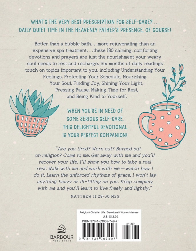 Six months of daily readings touch on topics important to you, including—Understanding Your Feelings, Protecting Your Schedule, Nourishing Your Soul, Finding Joy, Shining Your Light, Pressing Pause, Making Time for Rest, and Being Kind to Yourself. When you're in need of some serious self-care, this delightful devotional is your perfect companion!