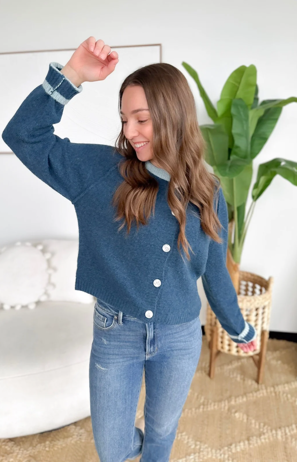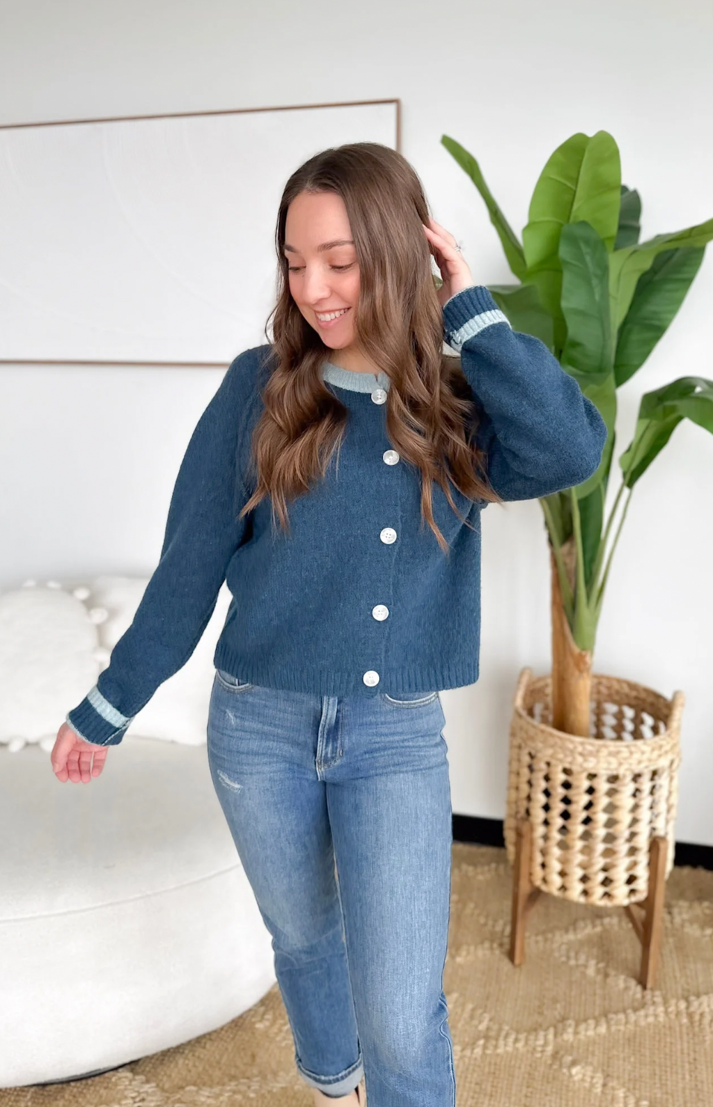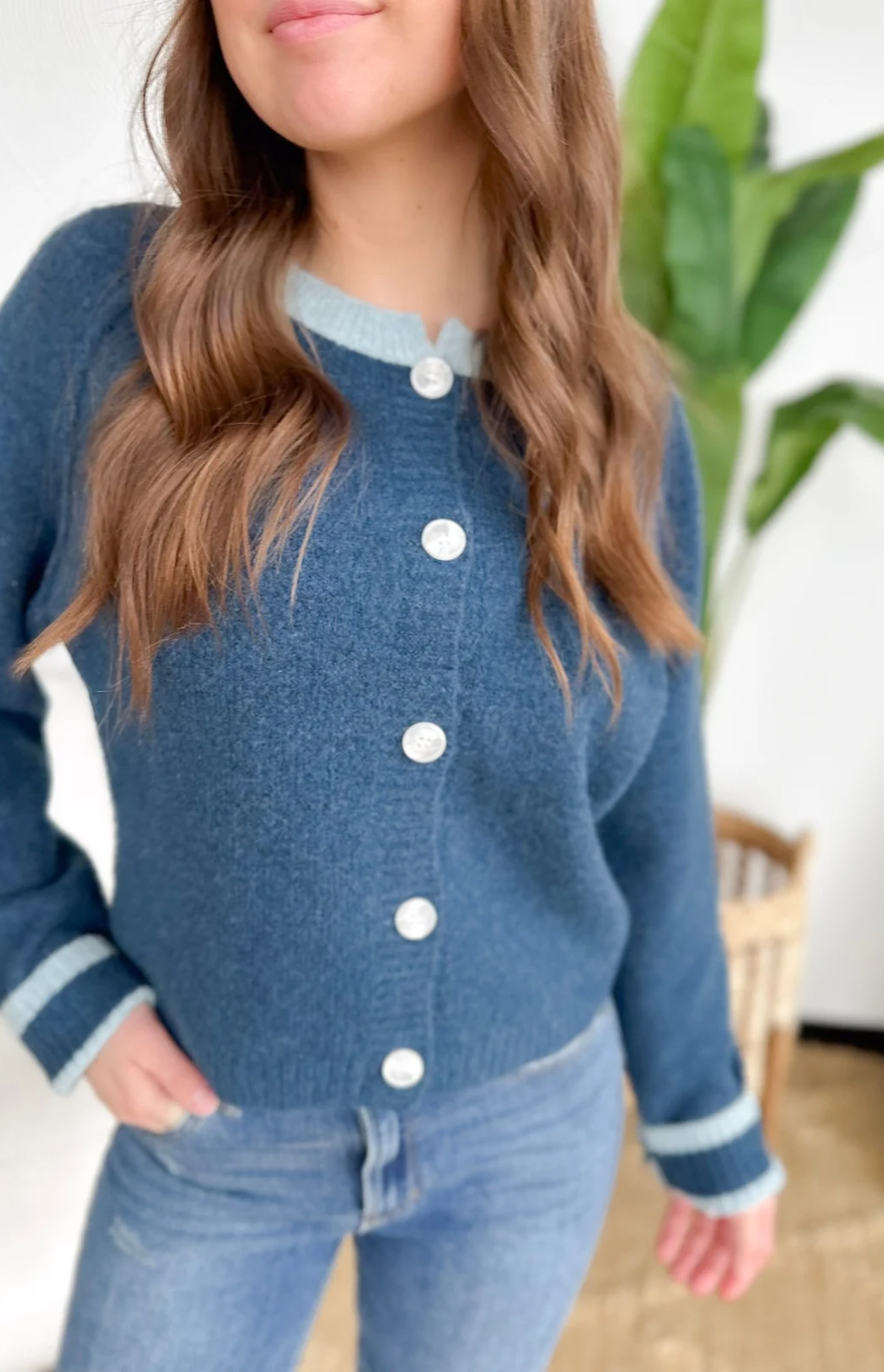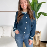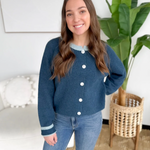 This blue knit button cardigan with light blue trim detailing is the perfect blend of classic and charming. The soft knit keeps you cozy without feeling bulky, while the contrast trim adds a polished touch that feels special but still easy. Button it up for a clean, put-together look or wear it open over a tee for everyday errands and meetings on the go.