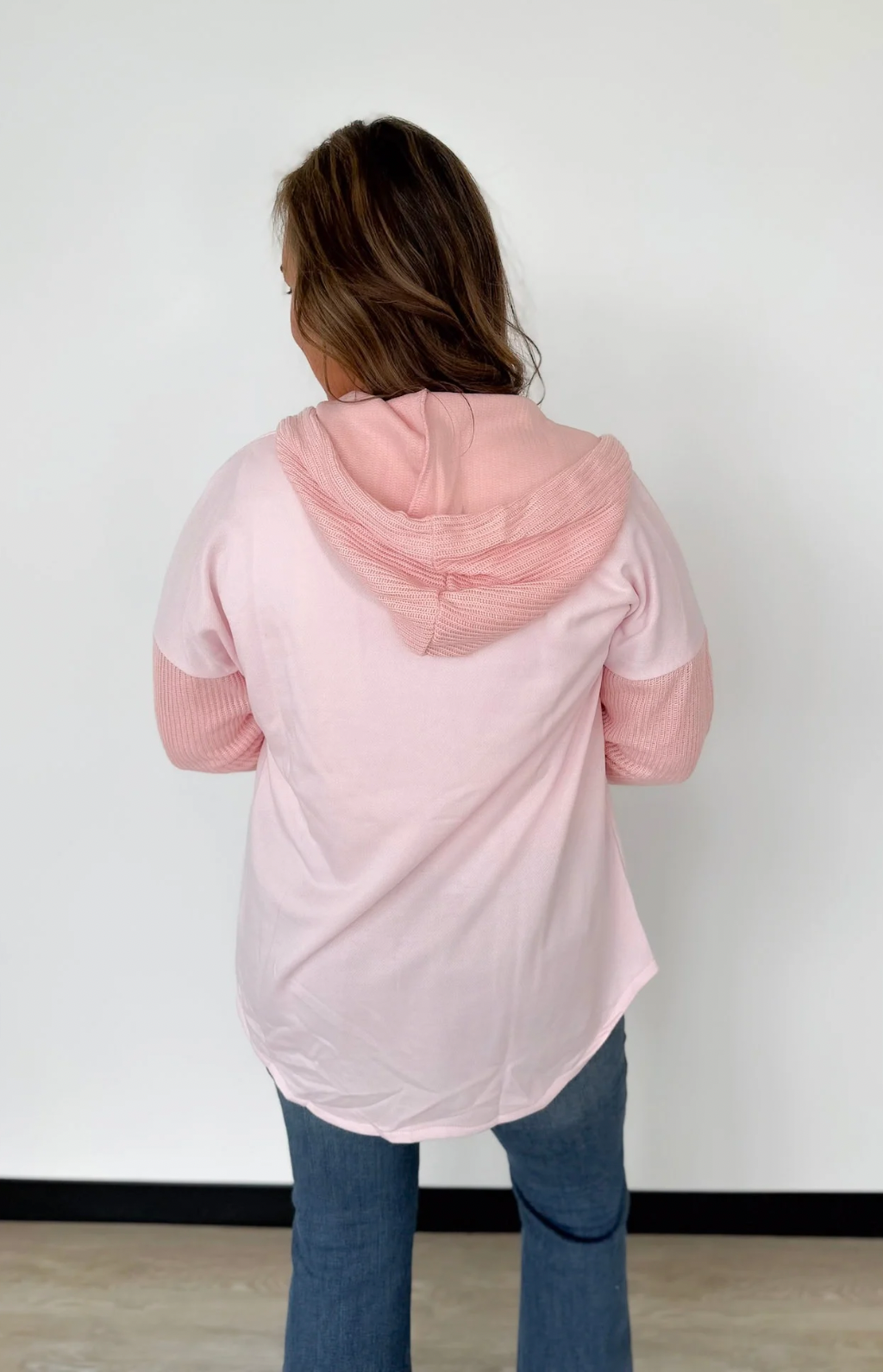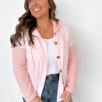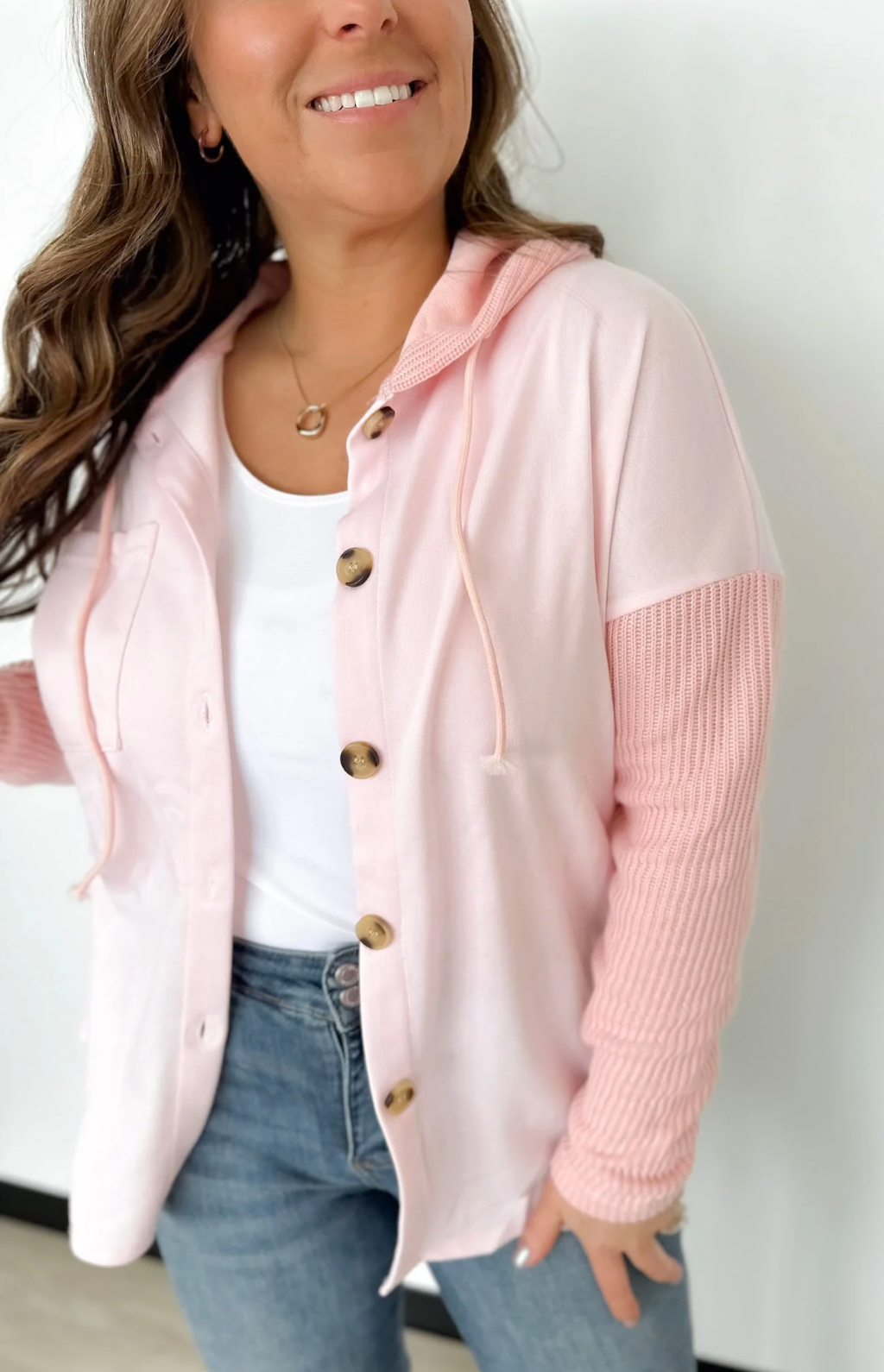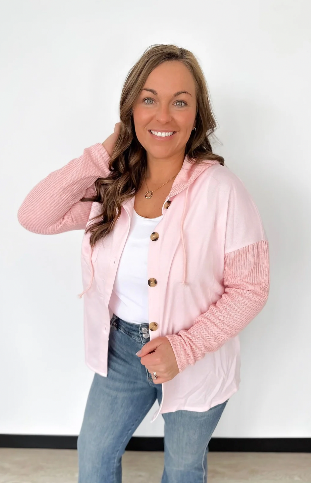 This pink button-up shacket is the perfect layering piece for those in-between days when you want cozy without the bulk. The contrast pink knit sleeves and hood add a soft, comfortable feel while giving it a stylish, elevated look. Easy to throw on over tees or tanks, it gives you that effortlessly pulled-together vibe in seconds. The button-up front makes it versatile for layering or wearing on its own. It’s a grab-and-go piece you’ll reach for when you want warmth, comfort, and confidence all in one.