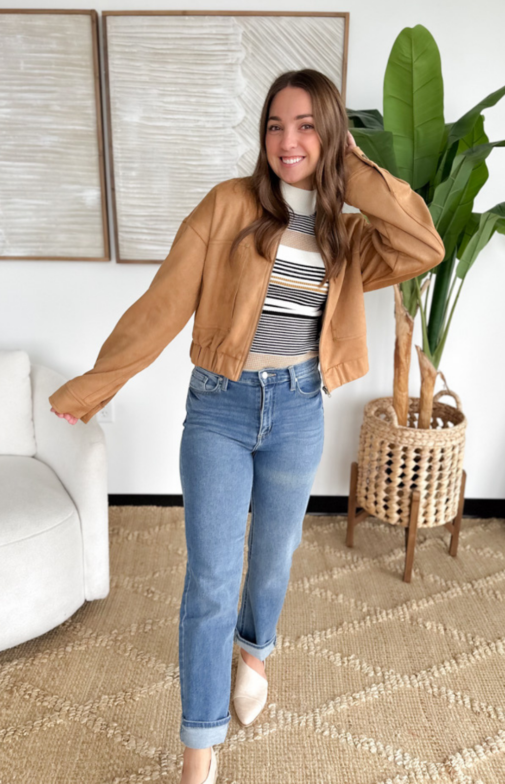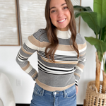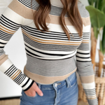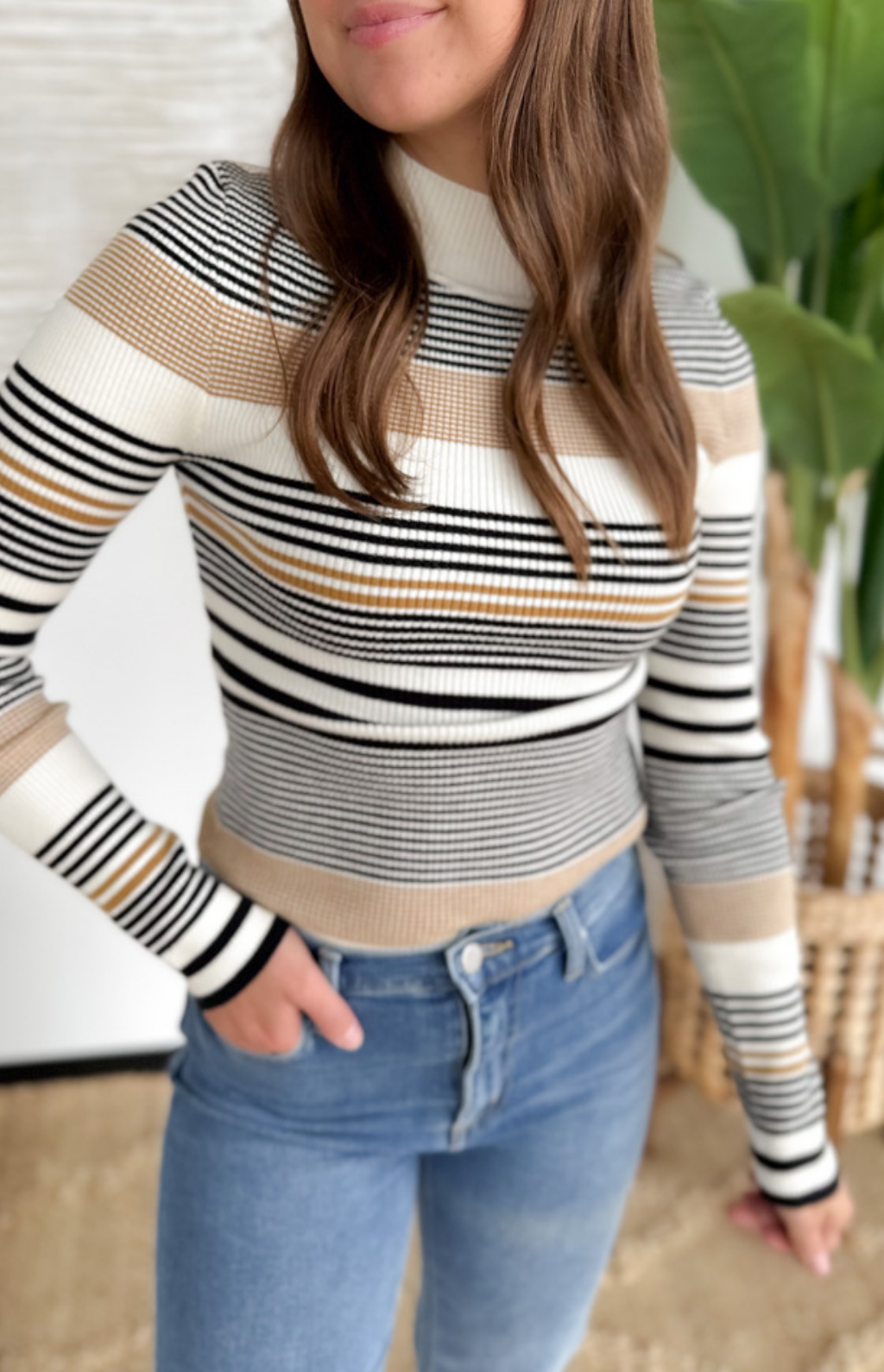 This ribbed long sleeve top is a chic staple with a bold twist. The horizontal black and mustard stripes are not only eye-catching but also super flattering. Its mock neckline adds a modern, polished touch, making it easy to dress up or down. The ribbed texture keeps it comfy with just the right amount of stretch, perfect for busy days on the go. Pair it with jeans, skirts, or layered under a jacket—this top is a go-to for effortless style with a little edge.