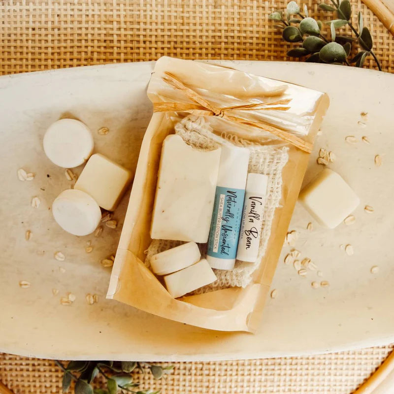 Includes: Shea Butter & Oat Shampoo, Conditioner, Oatmeal Milk & Honey Soap, Naturally Unscented Shea Lotion Stick, Vanilla Bean Tallow Lip Butter