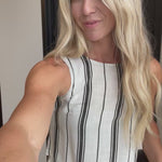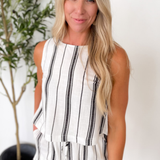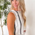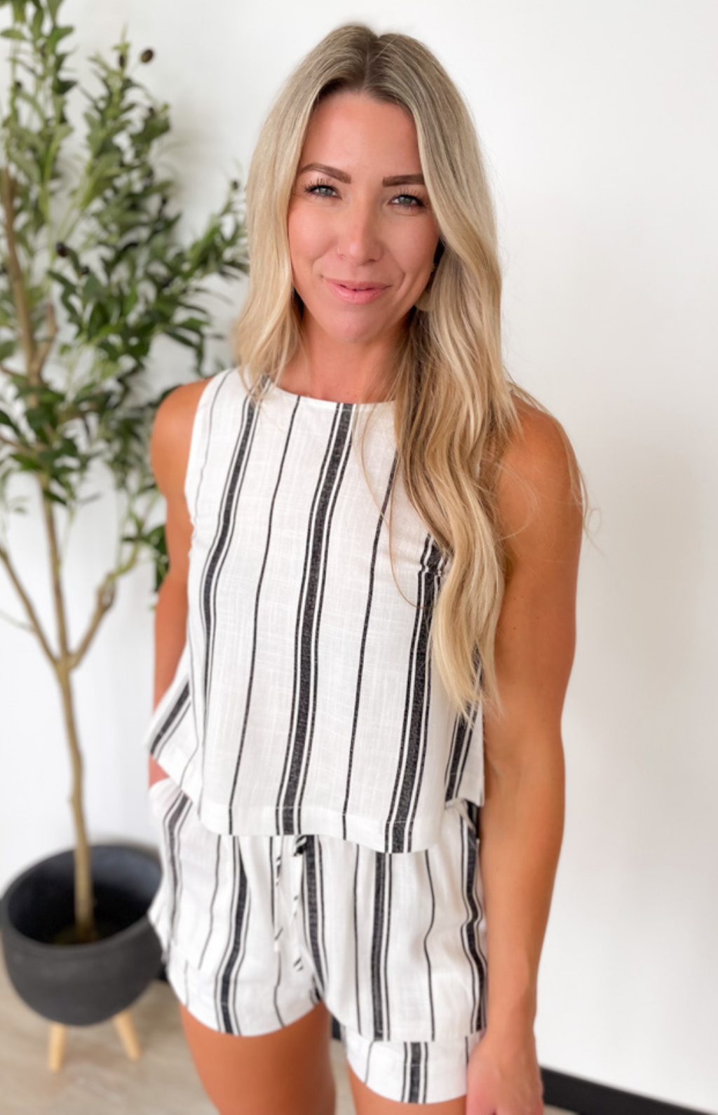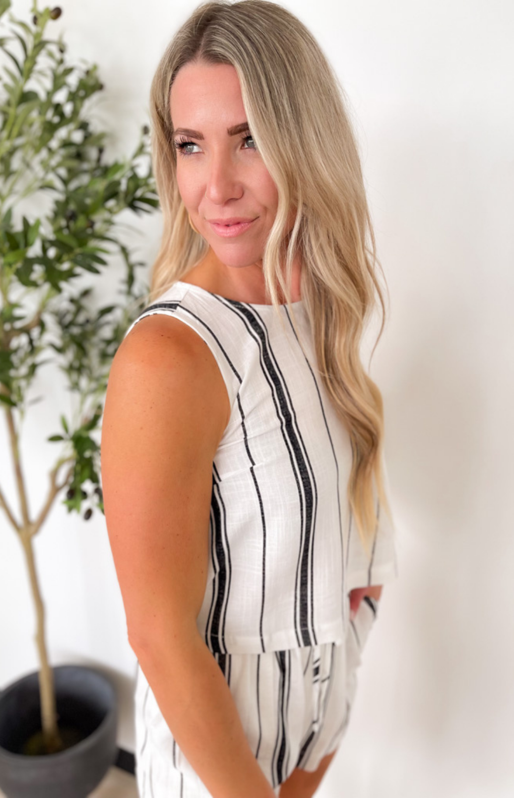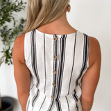 Add this trendy tank top to your everyday wardrobe! Featuring a classic striped pattern and a breezy linen-blend fabric, this tank top is perfect for warm sunny days. The relaxed fit and back button closure add effortless charm, making it an easy go-to for coastal adventures or casual outings! Style with the matching shorts for a trendy look!