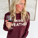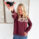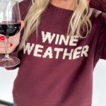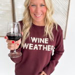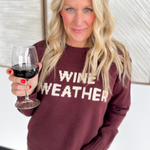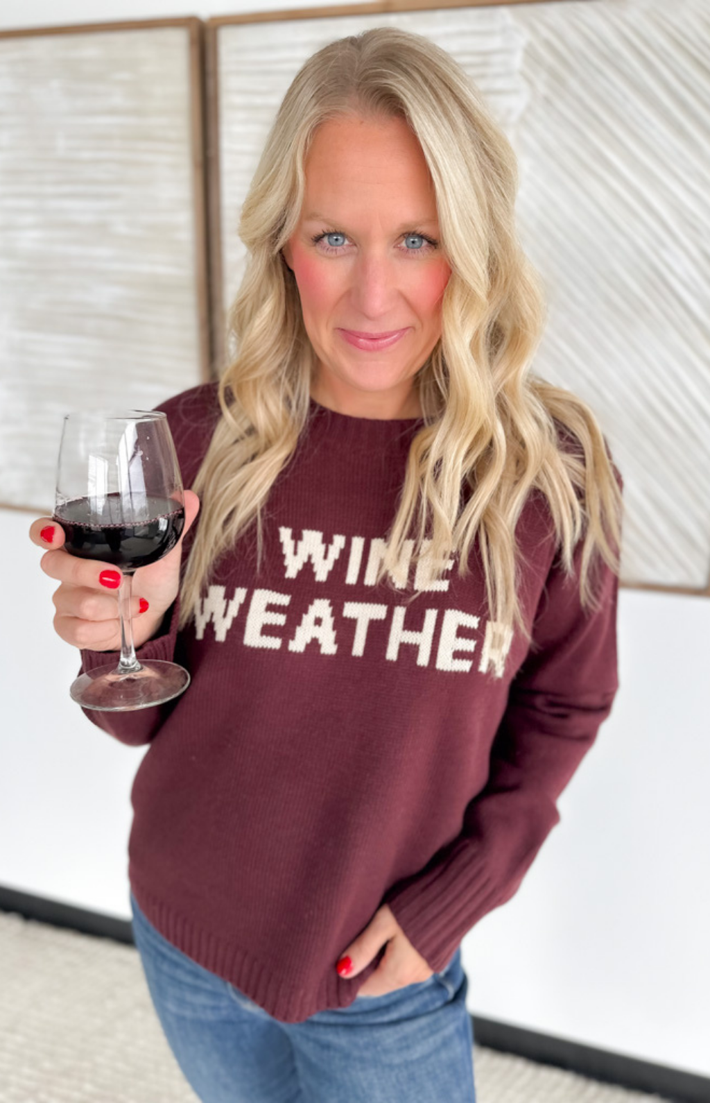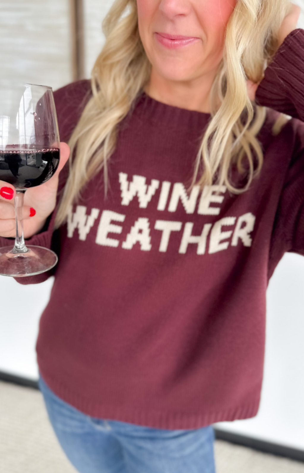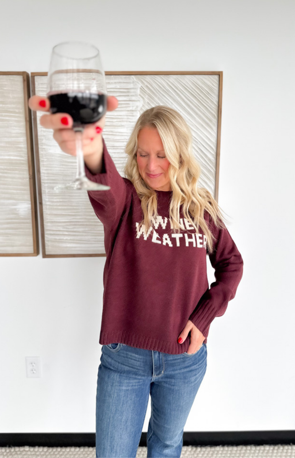 This soft knit dark purple sweater is made for cozy nights and your favorite glass in hand. The “Wine Weather” graphic on the front adds a playful, seasonal touch that’s perfect for fall gatherings or relaxed weekends in. With its comfy fit and soft, warm feel, it’s easy to throw on with jeans or leggings for an effortless, feel-good look. Fun, cozy, and just the right amount of cheeky—this sweater is a toast to your favorite time of year!